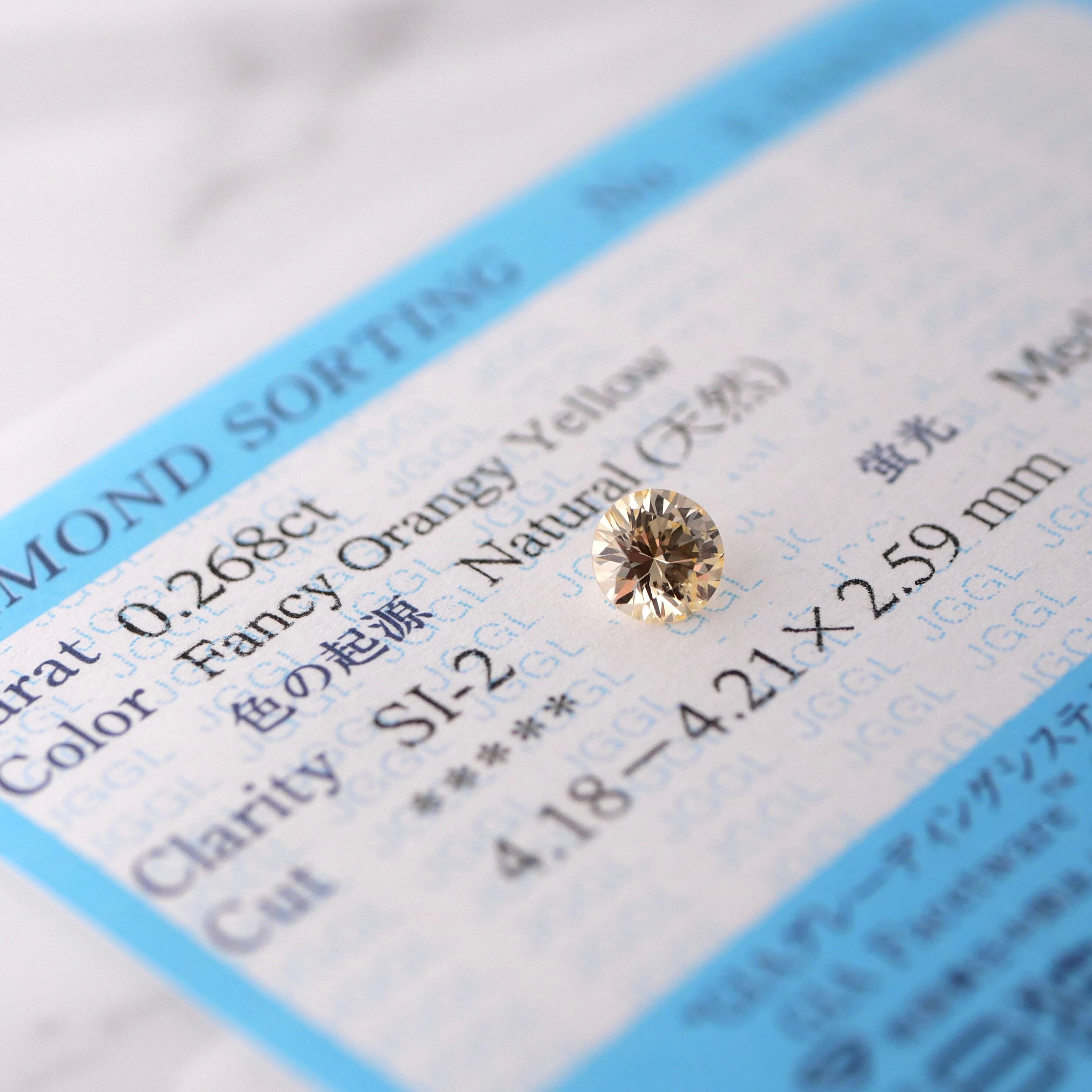 「Fancy Orange Yellow」はイエローを主色にオレンジがかった色合いを持つファンシーカラーダイヤモンドの色名称です。